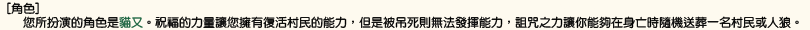 (貓又出場時,將會取代一名村民。在那同時村民會減少一人,人狼增加一人。)