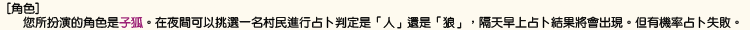 子狐 在夜間可以挑選一名村民進行占卜判斷是「人」還是「狼」,隔天早上占卜結果將會出現。但有機率失敗。