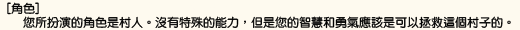 村民 沒有特殊的能力。但是您的智慧和勇氣應該是可以拯救這個村子的。