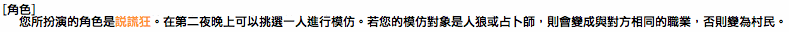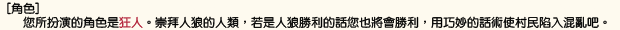 狂人 崇拜人狼的人類,若是人狼勝利的話您也將會勝利。