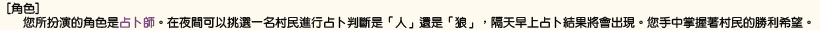 占卜師 在夜間可以挑選一名村民進行占卜判斷是「人」還是「狼」,隔天早上占卜結果將會出現。
