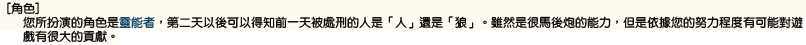靈能者 第二天以後可以得知前一天被處刑的人是「人」還是「狼」。